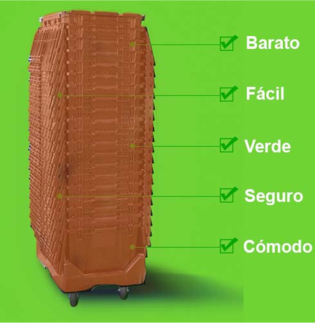 Es sostenible con la ecología, ya que cada caja de plástico se rehúsa cientos de veces antes de ser reciclada, generando cero emisiones. La limpieza se realiza con aire acondicionado para evitar el uso de productos químicos, no hay que armar nada ni poner precintos, todo es más rápido que en la caja de cartón. Se ahorra no sólo en dinero, sino también en tiempo.