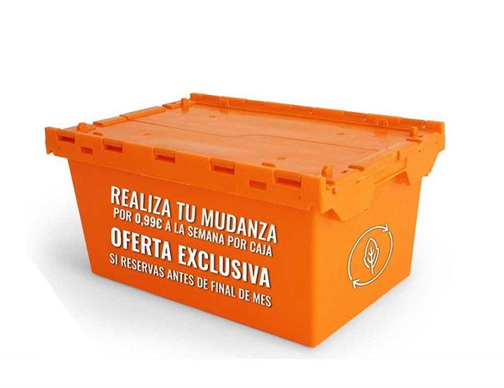 La caja está diseñada especialmente para el transporte, desde sus asas hasta su seguridad. Fácil de apilar cuando está vacía y que encaja perfectamente en los carritos especiales de mudanzas. Impermeable y resistente.